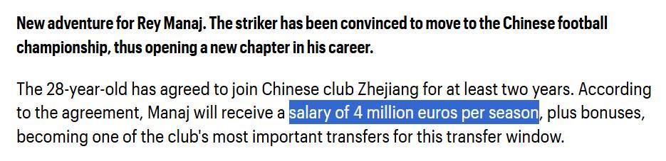 据报道,马纳伊已同意加盟中超浙江队,合同期至少两年。根据协议,马纳伊每个赛季将获得400万欧元的薪水(注:中超限薪令单外援最高年薪为300万欧,含奖金等),外加奖金。